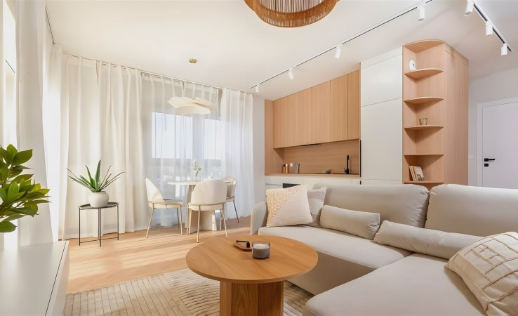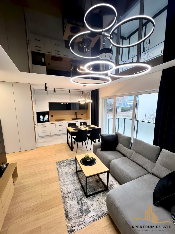 Salon z kuchnią i łazienka w pełni umeblowane i wyposażone. Pokoje wymagają umeblowania.