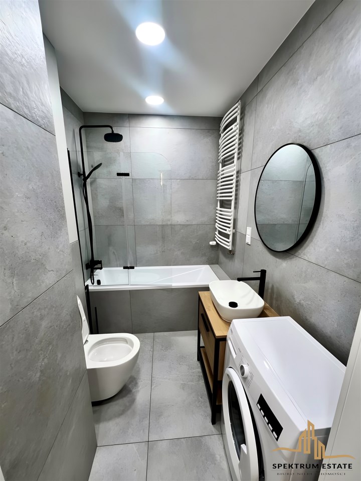 Wyposażenie łazienki | lustro, pralka, prysznic, umywalka, wanna, WC |