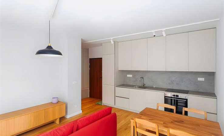 Mieszkanie zaprojektowane w nowoczesnym stylu , wykonane z wysokiej jakości materiałów .
