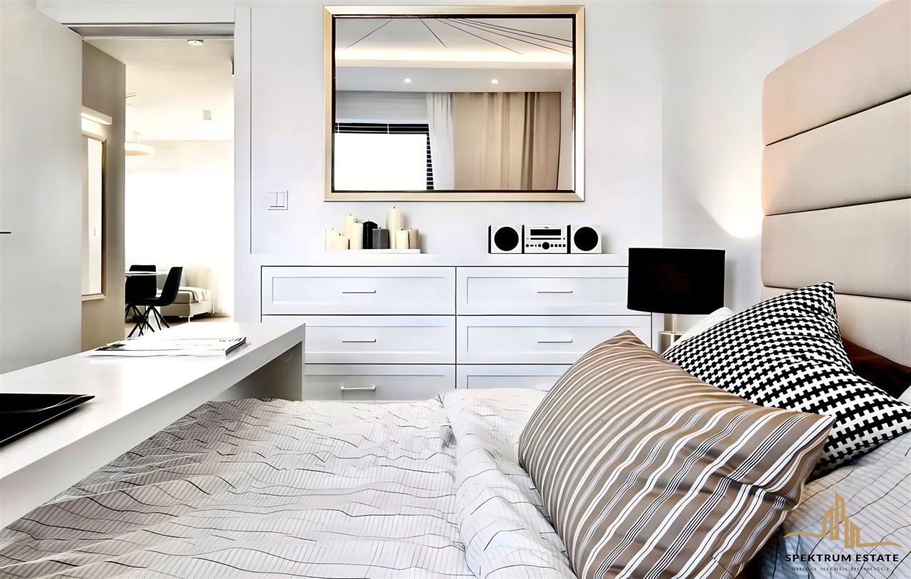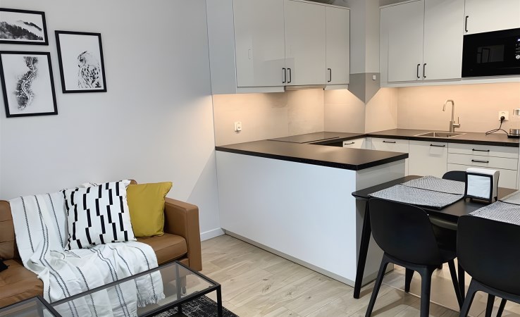 Luksusowy dwupokojowy apartament o powierzchni prawie 60 m2 znajduje się na I piętrze nowoczesnego apartamentowca z 2010r. W budynku jest winda.