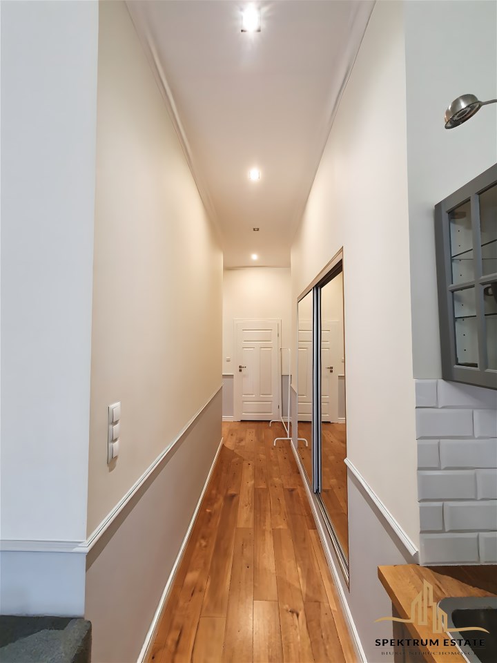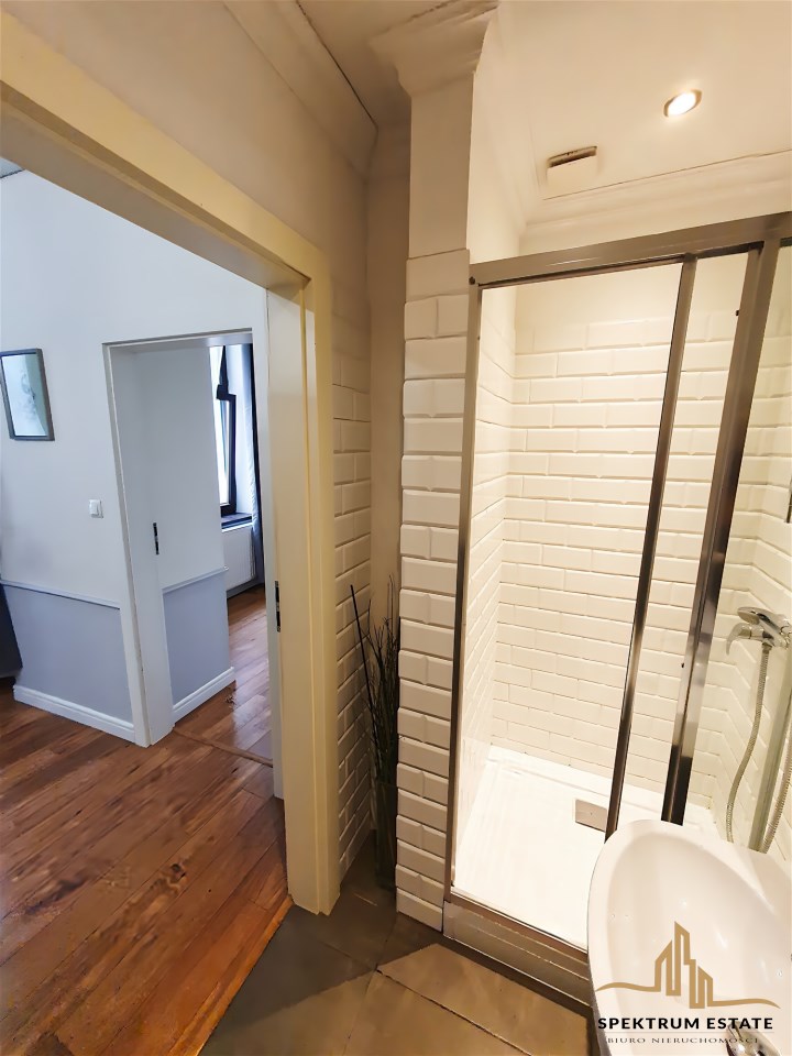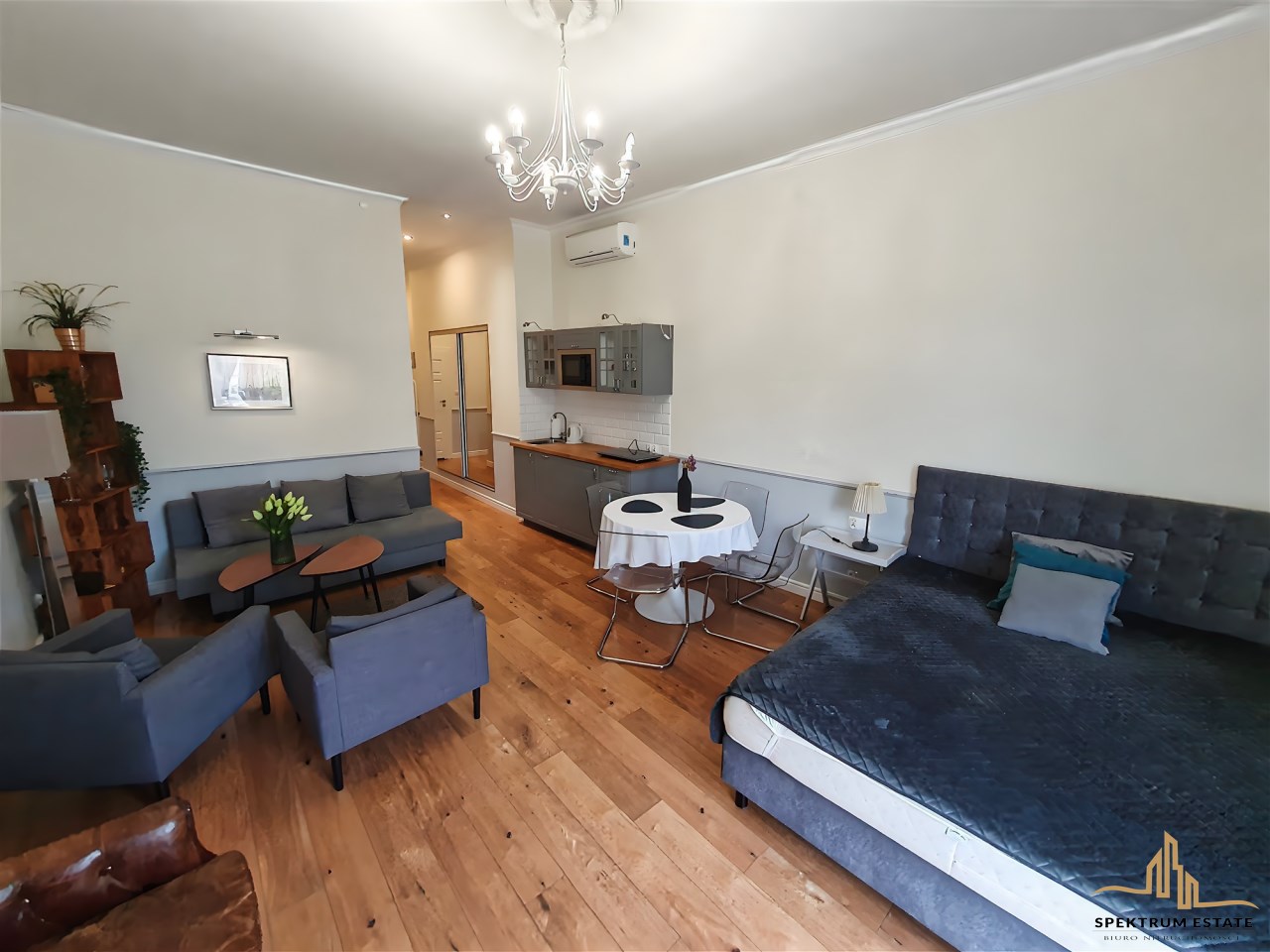 Mieszkanie nr 1 : Składa się z salonu z aneksem kuchennym oraz sypialnią w otwartej przestrzeni, komunikacji z szafami w zabudowie oraz łazienki. Balkon z widokiem na plac Szczepański.