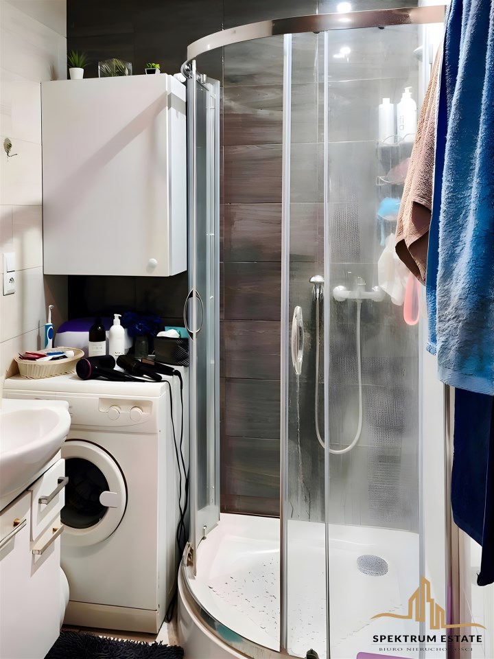 Wyposażenie łazienki | lustro, pralka, prysznic, umywalka, WC |