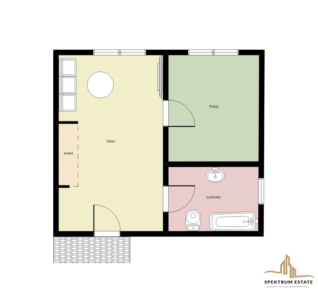 Mieszkanie o powierzchni 35,10 m2 składa się z: sypialni , salonu z aneksem kuchennym , łazienki z oknem.