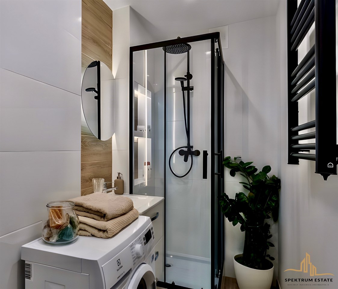 Wyposażenie łazienki | kabina prysznicowa, lustro, pralka, umywalka, WC |