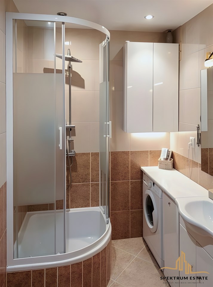 | Wyposażenie łazienki | pralka, WC, umywalka, prysznic, lustro, kabina prysznicowa |