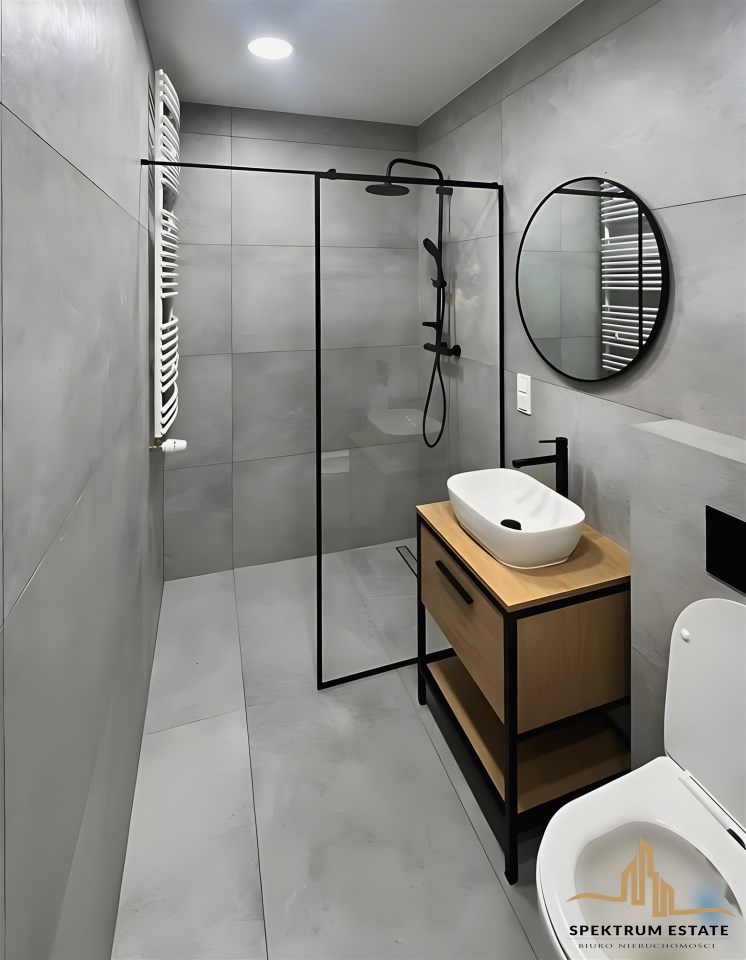 Wyposażenie łazienki | kabina prysznicowa, lustro, pralka, prysznic, umywalka, WC |