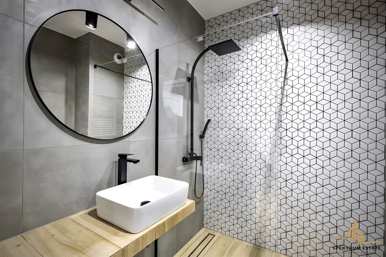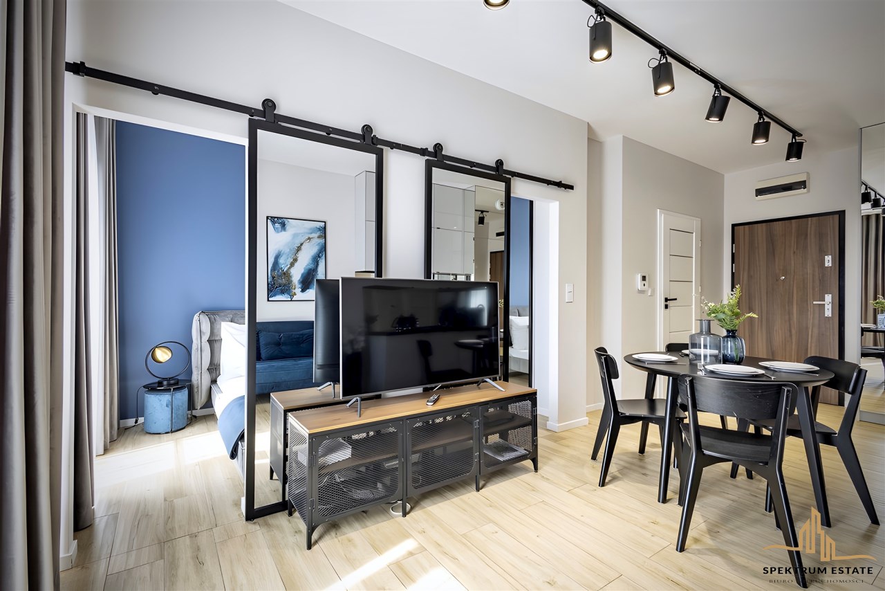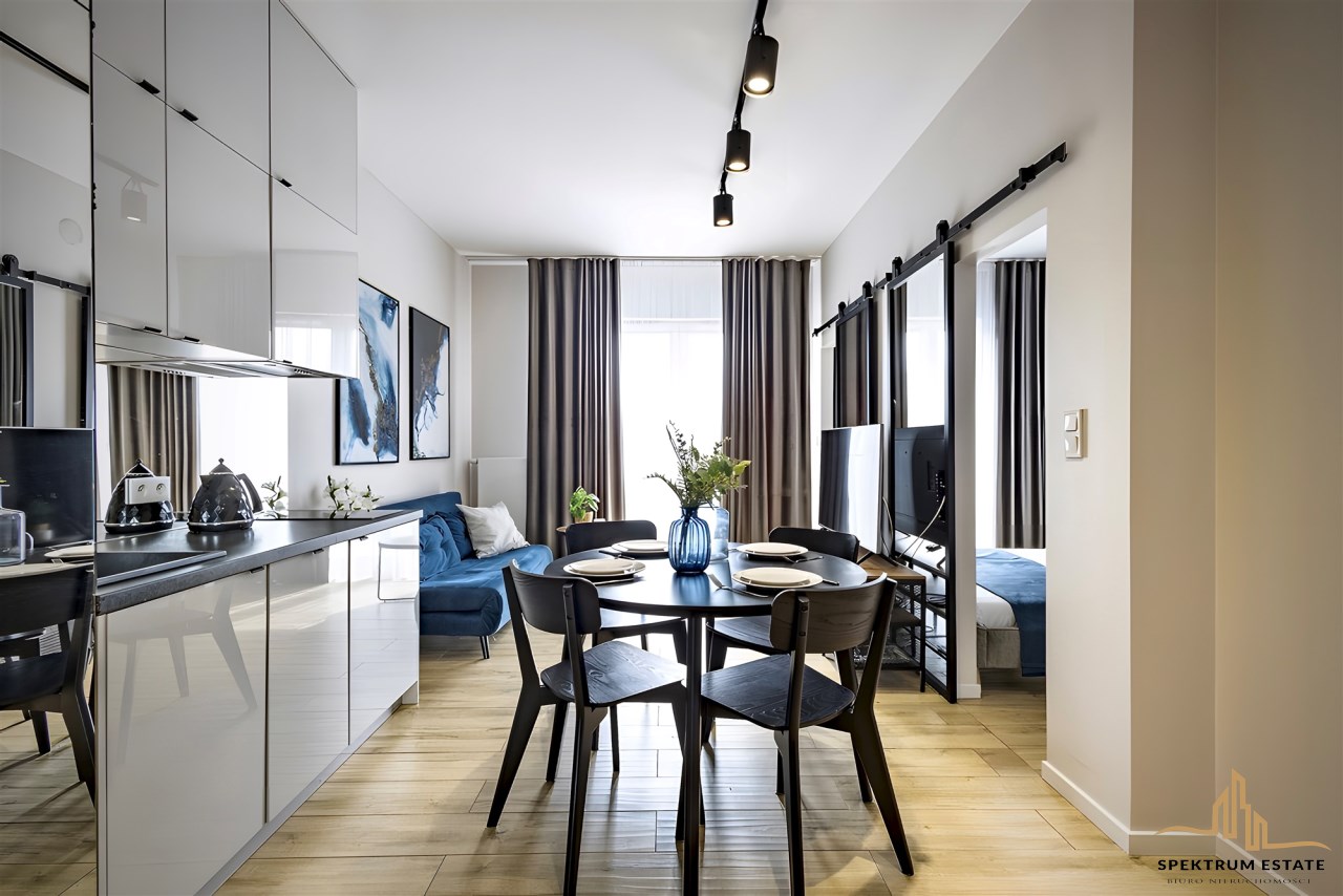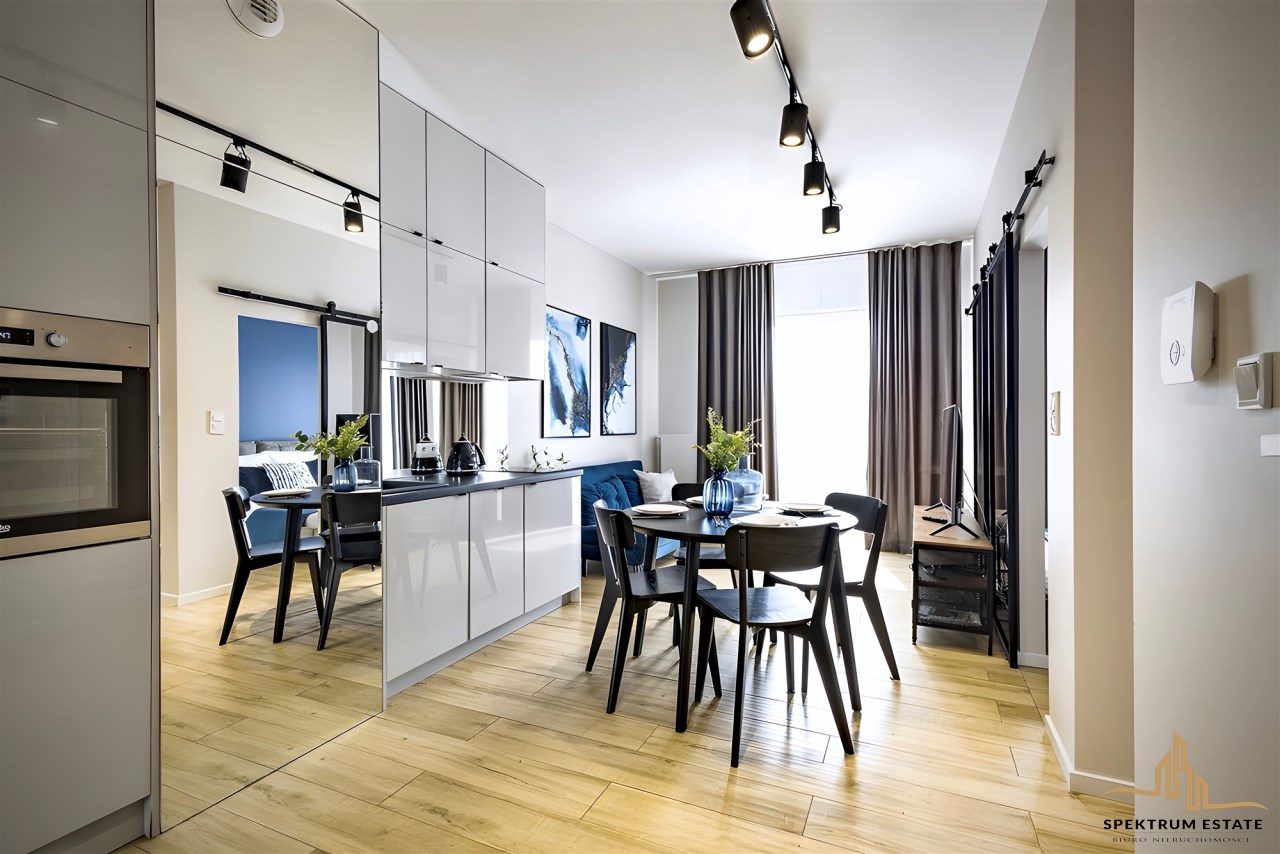 Lokal w pełni wyposażony i umeblowany, wykończony z najwyższej klasy materiałów z dbałością o każdy detal. Meble wykonano na zamówienie. W mieszkaniu pełny zestaw AGD/RTV